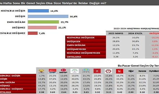 Bu pazar seçim olsa, iktidarın değişeceği algısı ölçüldüğünde, katılımcıların kesinlikle değişeceği ve değişeceğine olan inancı toplamda 46,8 olarak saptandı. İntegral’in 14 Mayıs Genel Seçimlerinden çok kısa bir süre önce yaptığı araştırmada yüzde 55,3 olan iktidarın değişeceğine olan inancın bugüne göre daha yüksek olması dikkat çekti. Son genel seçimlerin hemen öncesinde iktidarın değişmesi beklentisi, karşılaştırmada yüzde 12,5 geriledi. “Emin değilim” yanıtını verenlerde de 14 Mayıs öncesine göre artış olduğu izlendi. Bu pazar seçim olsa oy tercihine göre ise; CHP tabanıyüzde 63 oranında iktidarın değişeceğini ifade ettiği; AK Parti tabanının ise “kesinlikle değişir ve değişir” diyerek toplamda yüzde 61,9 oranına ulaştığı görüldü. Araştırmanın bu başlığında, iktidarı elinde bulunduran AK Parti ve MHP seçmeninde emin olmayanların oranı da dikkat çekti.