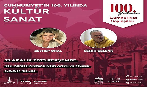 “Cumhuriyetin 100. Yılında Kültür ve Sanat” söyleşisinin konukları; Semih Çelenk ve gazeteci-yazar Zeynep Oral olacak. Söyleşide, kültür-sanat alanındaki değişim ve gelişim süreci farklı yönleriyle ele alınacak.