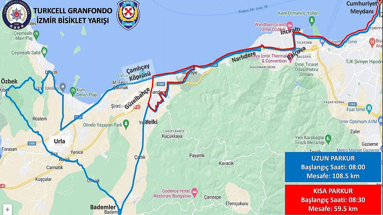İzmir, Cumhuriyet’in 100. yılında bir büyük bisiklet organizasyonuna daha ev sahipliği yapmaya hazırlanıyor. Gençlik ve Spor Bakanlığı’nın onayı ve İzmir Valiliği’nin izniyle 22 Ekim Pazar günü Turkcell Granfondo İzmir 2023 Bisiklet Yarışı düzenlenecek. Kısa ve uzun parkur olmak üzere iki etapta yapılacak yarış kapsamında, 06.00 – 15.00 saatleri arasında yarış güzergâhı üzerindeki yollar trafiğe kapatılacak. Haydar Aliyev Caddesi ile İnciraltı Caddesi de trafiğe kapatılacağından rotada faaliyet gösteren ESHOT otobüsleri de geçici olarak farklı güzergâhlarda çalışacak. Üçkuyular Feribot İskelesi hizmet veremeyecek.Kısa parkur 08.30’ta