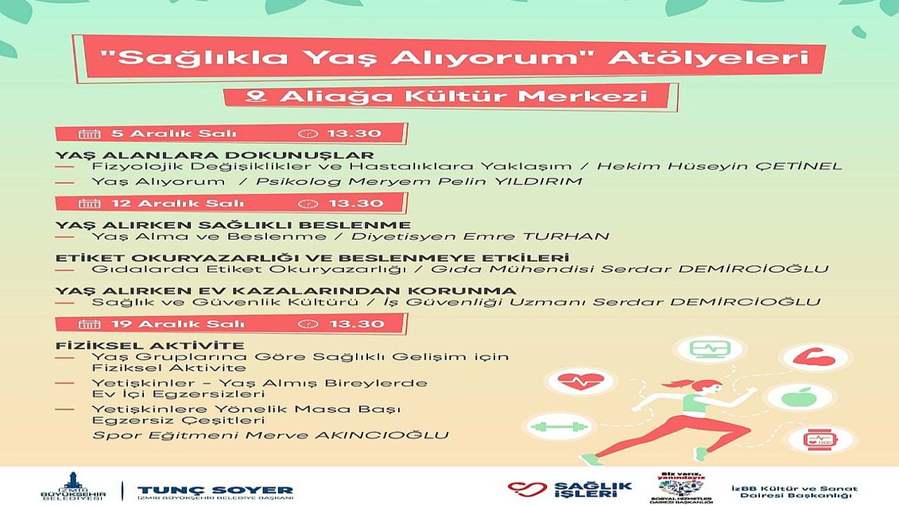 İzmir Büyükşehir Belediyesi ile Karabağlar Belediyesi iş birliğiyle farklı meslek gruplarından alanında uzman kişilerin katılımıyla “Sağlıkla Yaş Alıyorum” farkındalık seminerleri ve atölyeleri düzenlenecek. Programlar 21 Kasım-20 Aralık 2023 tarihleri arasında Aliağa Kültür Merkezi ile Karabağlar Belediyesi Şehit Gürcan Ulucan, Çalıkuşu ve Nokta semt merkezlerinde olacak. Psikolog, diyetisyen, hekim, gıda mühendisi, spor eğitmeni ve iş güvenliği uzmanı eğitimcilerin öncülüğünde yapılacak seminerlerde yurttaşlar; doğru beslenmeden fiziksel egzersizlere, etiket okuryazarlığından yaş almanın psikolojik etkilerine kadar pek çok konuda bilgi sahibi olacak. Güvenli, sağlıklı ve mutlu yaş almanın ipuçlarının verileceği seminerlerin bir kısmı 3 haftalık katılım belgeli atölyeler şeklinde düzenlenecek.Sağlıkla yaş alıyorum farkındalık seminerleri etkinliklerinin programı şöyle:Aliağa Kültür Merkezi (21 Kasım 2023- Saat 10:30): “Yaş alanlara dokunuşlar”-Fizyolojik Değişiklikler ve Hastalıklara Yaklaşım-Hekim Hüseyin Çetinel, “Yaş Alıyorum”- Psikolog Meryem Pelin Yıldırım, “Yaş alırken sağlıklı beslenme” - Yaş Alma ve Beslenme - Diyetisyen Emre Turhan, “Fiziksel Aktivite”, “Yaş Gruplarına Göre Sağlıklı Gelişim için Fiziksel Aktivite - Spor Eğitmeni Merve Akıncıoğlu.Karabağlar Belediyesi-Şehit Gürcan Ulucan Semt Merkezi ((22 Kasım 2023 Saat 10:00)-Karabağlar Belediyesi-Nokta Semt Merkezi (29 Kasım 2023 Saat 10:00)-“Yaş alanlara dokunuşlar”-Fizyolojik Değişiklikler ve Hastalıklara Yaklaşım-Hekim Hüseyin Çetinel, Sağlıklı Yaş Alıyorum Atölyeleri.Aliağa Kültür Merkezi 1. Modül (05 Aralık 2023 – 13:30)“Yaş alanlara dokunuşlar”-Fizyolojik Değişiklikler ve Hastalıklara Yaklaşım-Hekim Hüseyin Çetinel, “Yaş Alıyorum”- Psikolog Meryem Pelin Yıldırım.Aliağa Kültür Merkezi 2. Modül (12 Aralık 2023 – 13:30)“Yaş alırken sağlıklı beslenme” - Yaş Alma ve Beslenme - Diyetisyen Emre Turhan, Etiket Okuryazarlığı ve beslenmeye etkileri” -Gıdalarda Etiket Okuryazarlığı - Gıda Mühendisi Serdar Demircioğlu, “Yaş alırken ev kazalarından korunma” -Sağlık ve Güvenlik Kültürü - İş Güvenliği Uzmanı Serdar Demircioğlu.Aliağa Kültür Merkezi 3. modül (19 Aralık 2023 – 13:30)“Fiziksel Aktivite”- Yaş Gruplarına Göre Sağlıklı Gelişim için Fiziksel Aktivite-Yetişkinler-Yaş Almış Bireylerde Ev İçi Egzersizleri-Yetişkinlere Yönelik Masa Başı Egzersiz ÇeşitleriSpor Eğitmeni Merve Akıncıoğlu.Karabağlar Çalıkuşu Semt Merkezi 1. Modül (06 Aralık 2023 – 10:00)“Yaş alanlara dokunuşlar”-Fizyolojik Değişiklikler ve Hastalıklara Yaklaşım-Hekim Hüseyin Çetinel, “Yaş Alıyorum”- Psikolog Meryem Pelin Yıldırım.Karabağlar Çalıkuşu Semt Merkezi 2. Modül (13 Aralık 2023 – 10:00)“Yaş Alırken Sağlıklı Beslenme”-Yaş Alma ve Beslenme - Diyetisyen Emre Turhan -“Etiket okuryazarlığı ve beslenmeye etkileri” - Gıdalarda Etiket Okuryazarlığı - Gıda Mühendisi Serdar Demircioğlu, “Yaş alırken ev kazalarından korunma” -Sağlık ve Güvenlik Kültürüİş Güvenliği Uzmanı Serdar Demircioğlu.Karabağlar Çalıkuşu Semt Merkezi 3. Modül (20 Aralık 2023 – 10:00)“Fiziksel Aktivite”- Yaş Gruplarına Göre Sağlıklı Gelişim için Fiziksel Aktivite-Yetişkinler-Yaş Almış Bireylerde Ev İçi Egzersizleri-Yetişkinlere Yönelik Masa Başı Egzersiz ÇeşitleriSpor Eğitmeni Merve Akıncıoğlu.